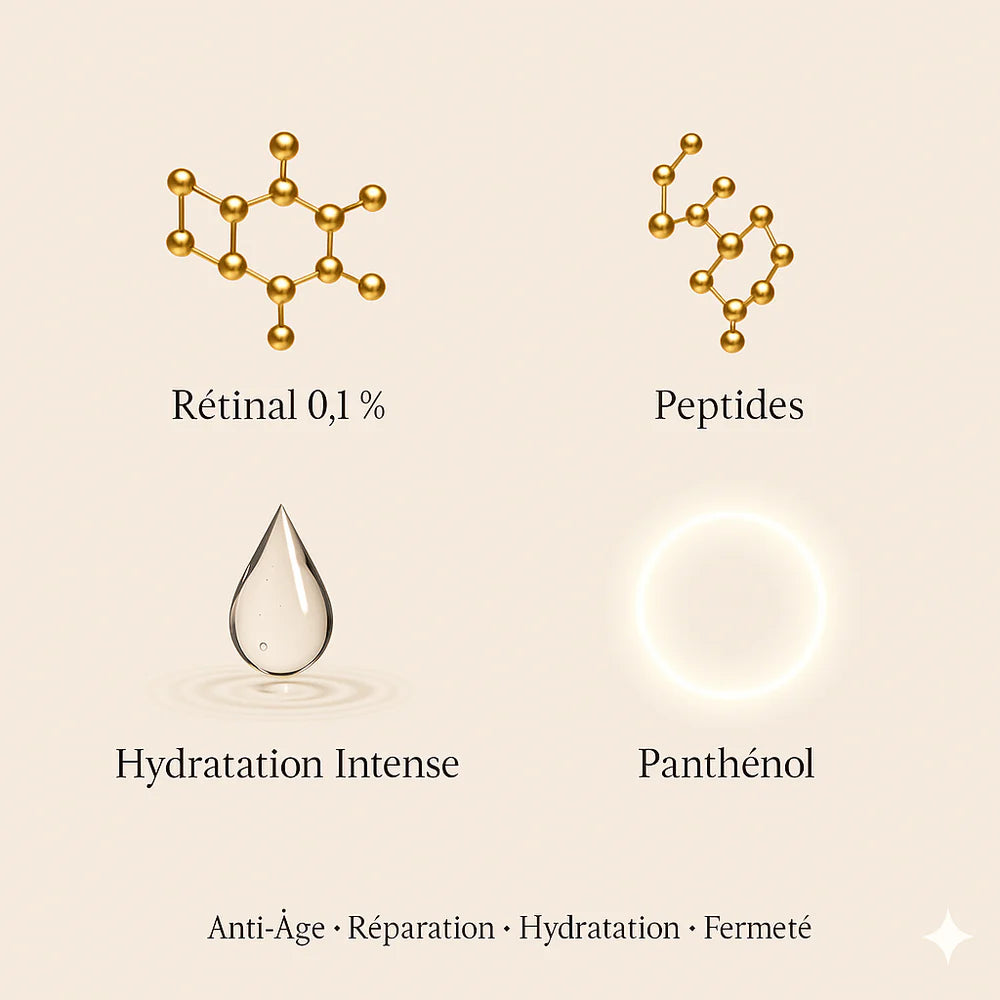 Forme avancée de la vitamine A, plus stable et plus efficace que le rétinol, favorisant le renouvellement cellulaire, la réduction des rides et l’amélioration de la fermeté, avec une meilleure tolérance cutanée.
