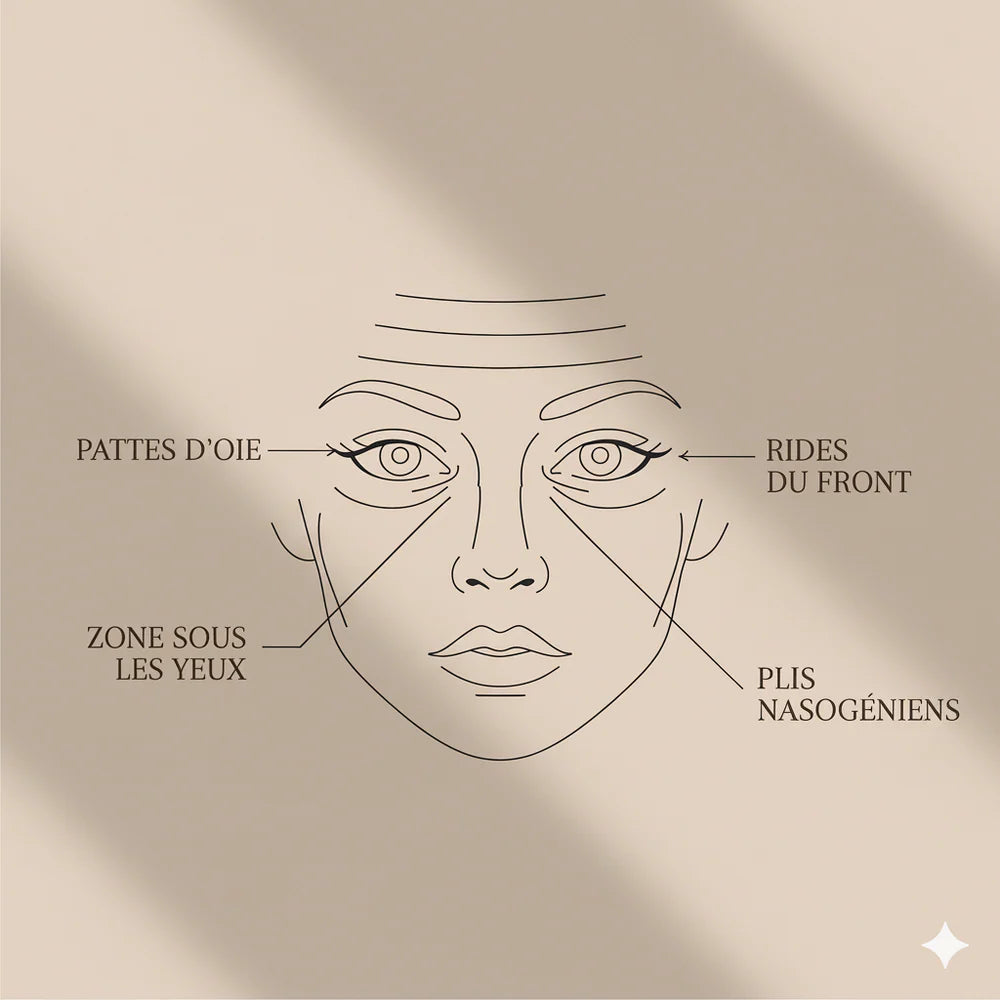 Rides et ridules atténuées (front, contour de la bouche, sillons)